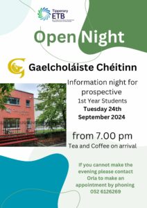 Gaelcholáiste Chéitinn is a newly established school with a young and energetic staff. It is situated in a new purpose-built block, with both general and practical rooms fitted out with up to date equipment and facilities We are dedicated to providing the best and broadest education possible for all our students. We provide a broad range of subjects at both Junior and Senior Cycle, and a comprehensive array of extra-curricular activities.